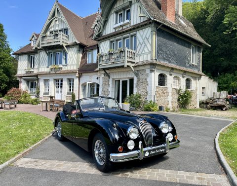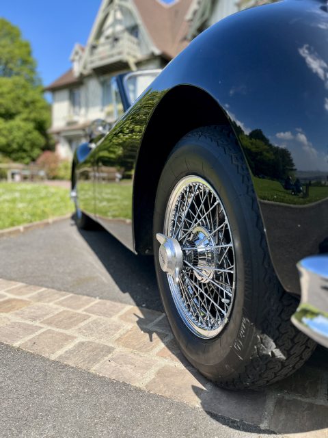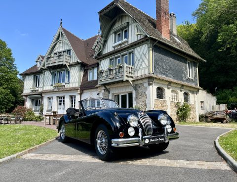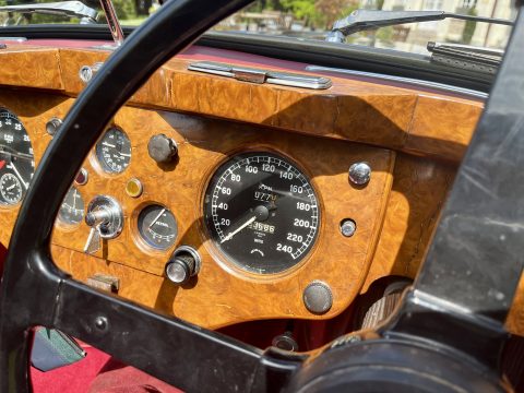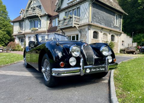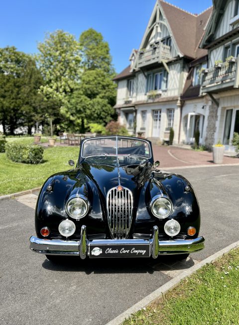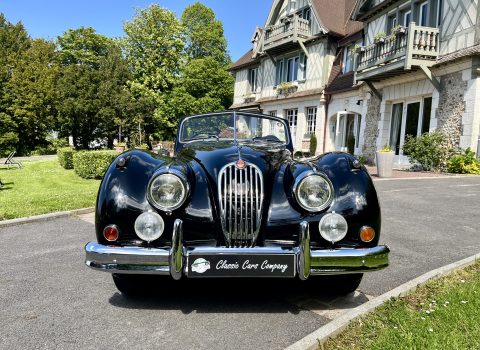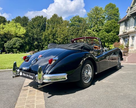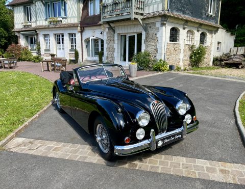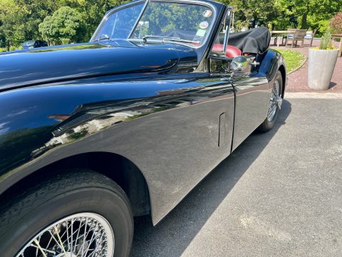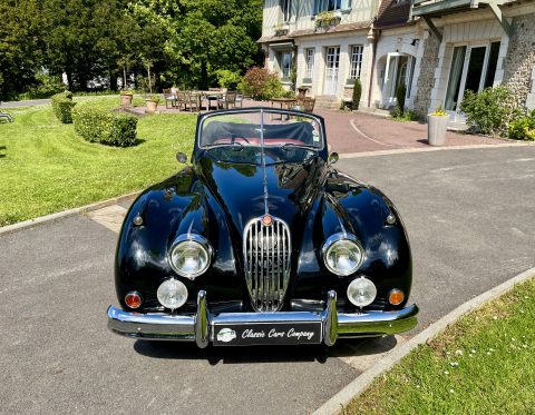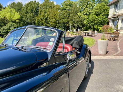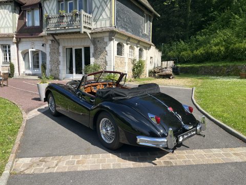 Cette Jaguar XK140 à été livrée neuve dans la concession Jaguar à Paris. En effet, le premier propriétaire, monégasque, était un pilote de course et désirait rouler à droite dans sa Jaguar. Cette XK a donc le volant à droite et le compteur en kilomètre par heure !