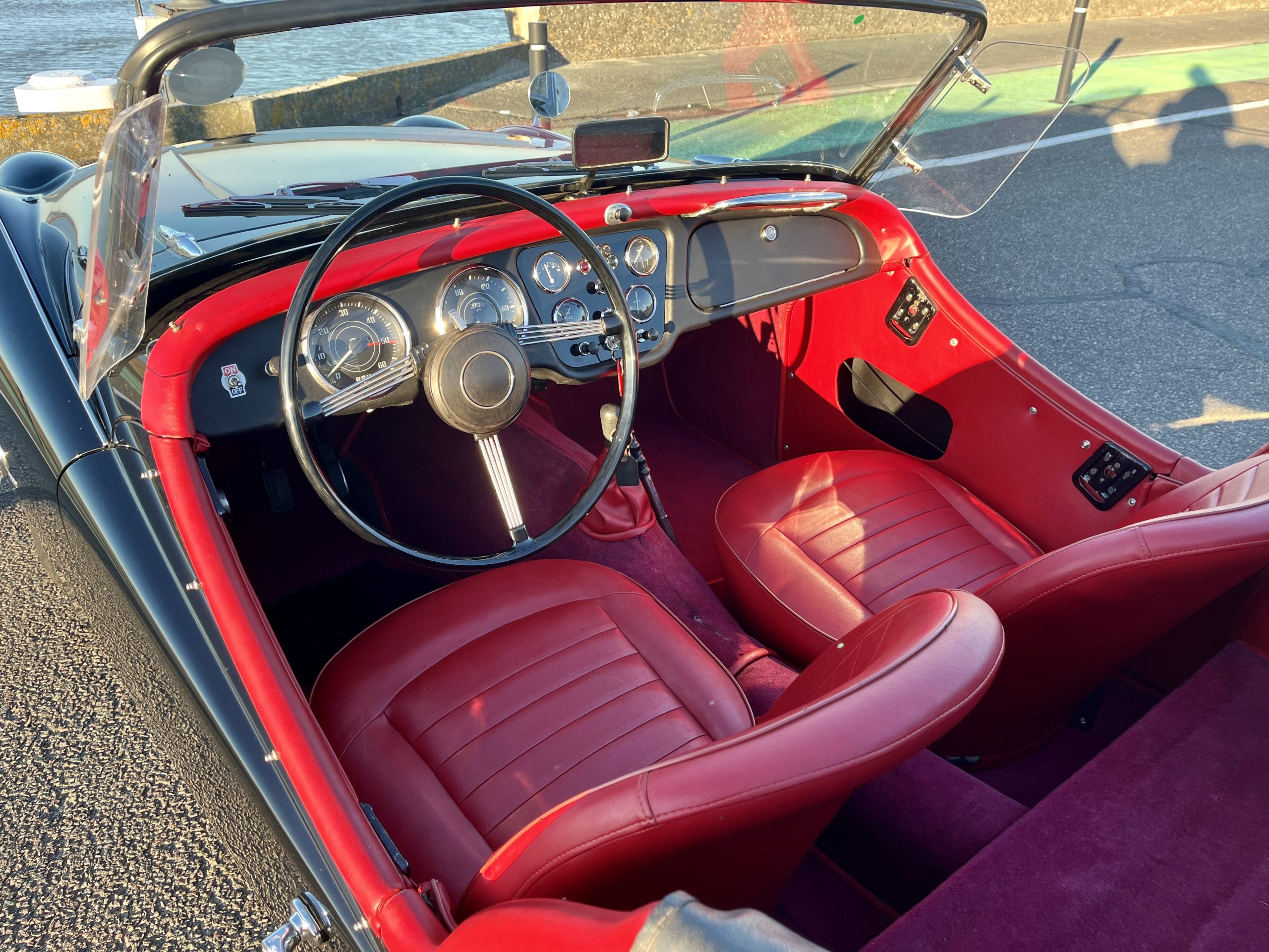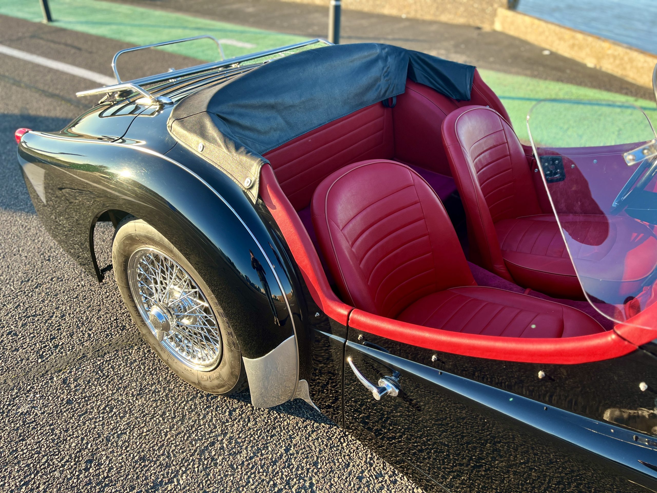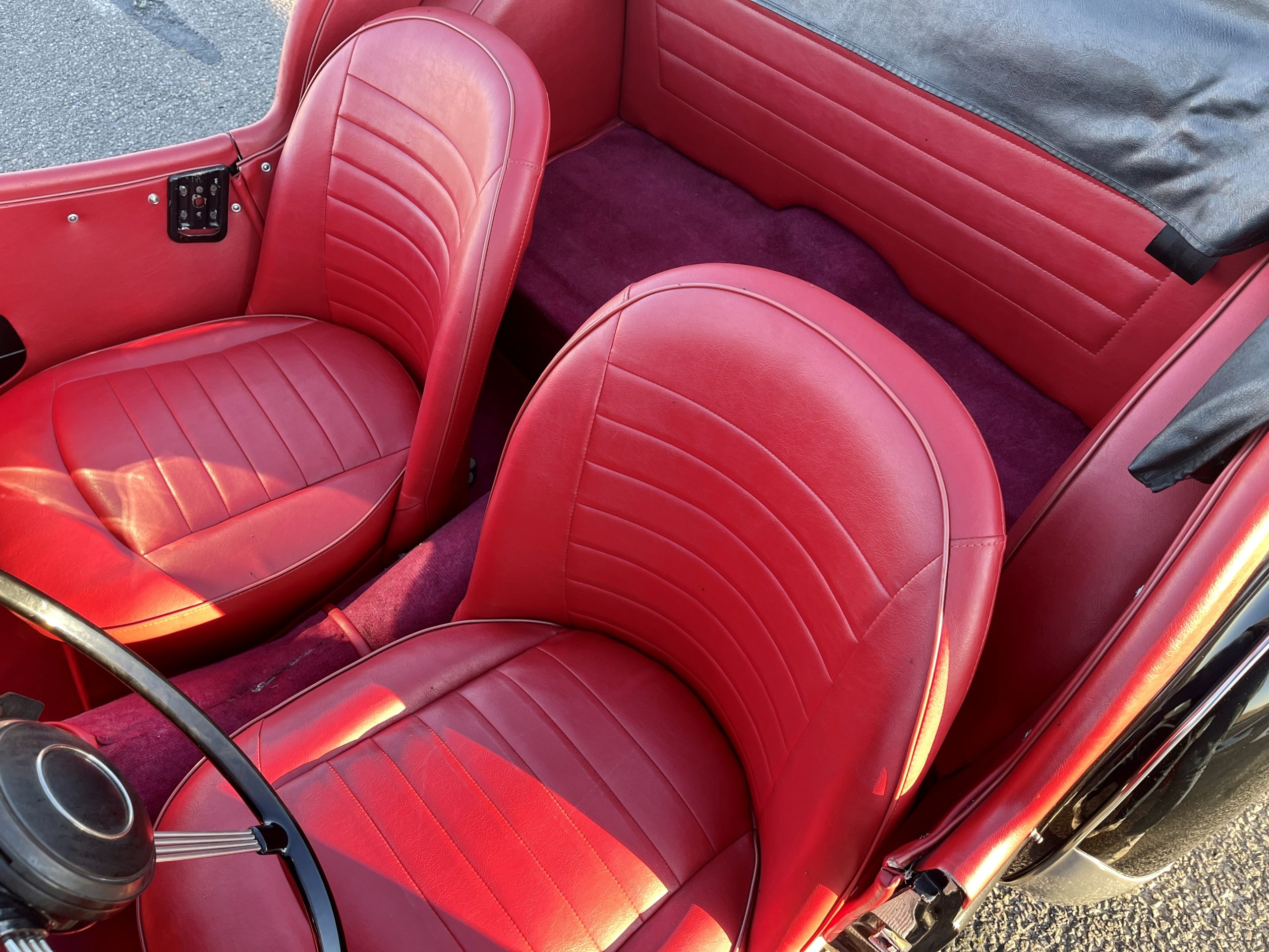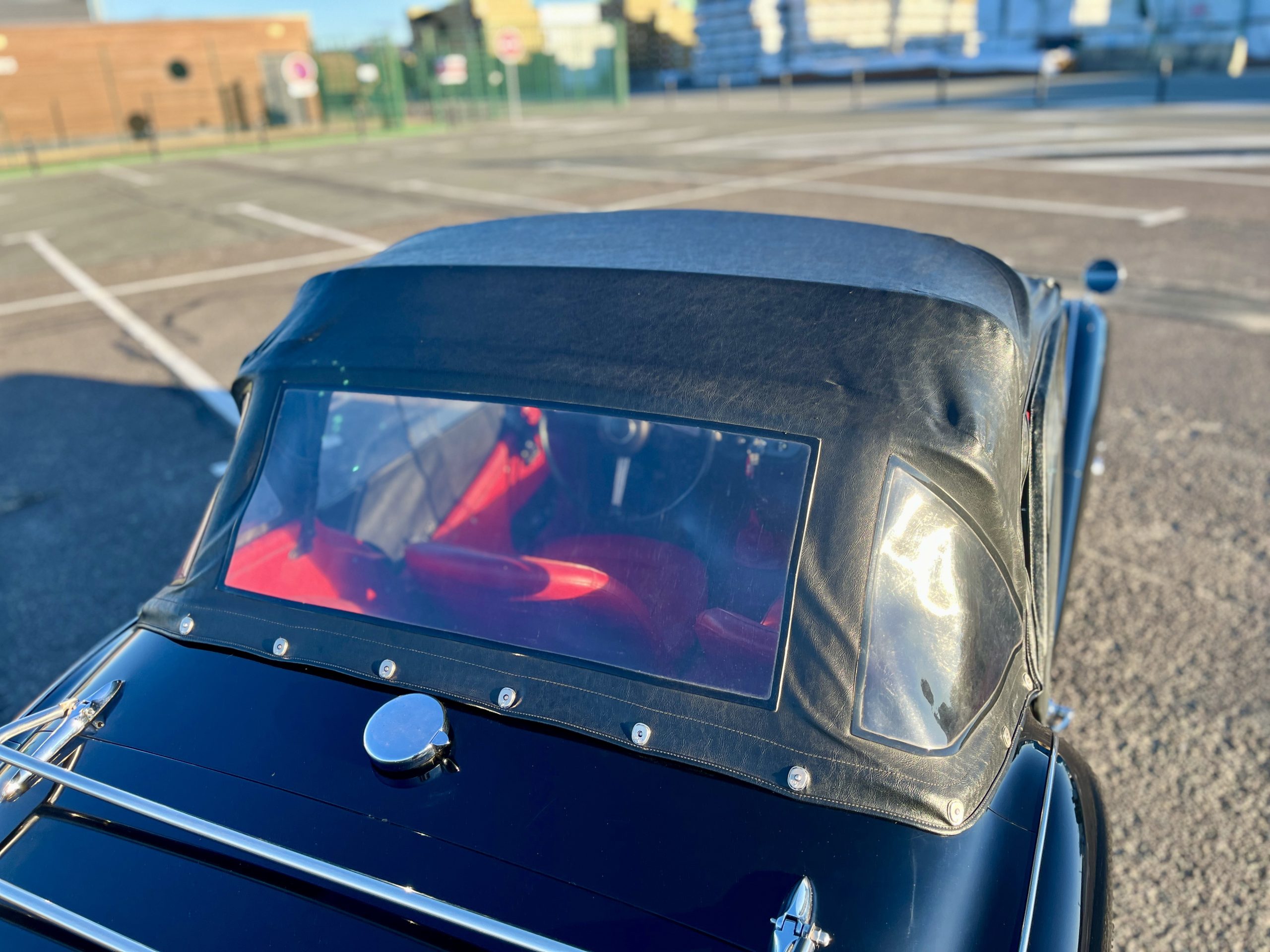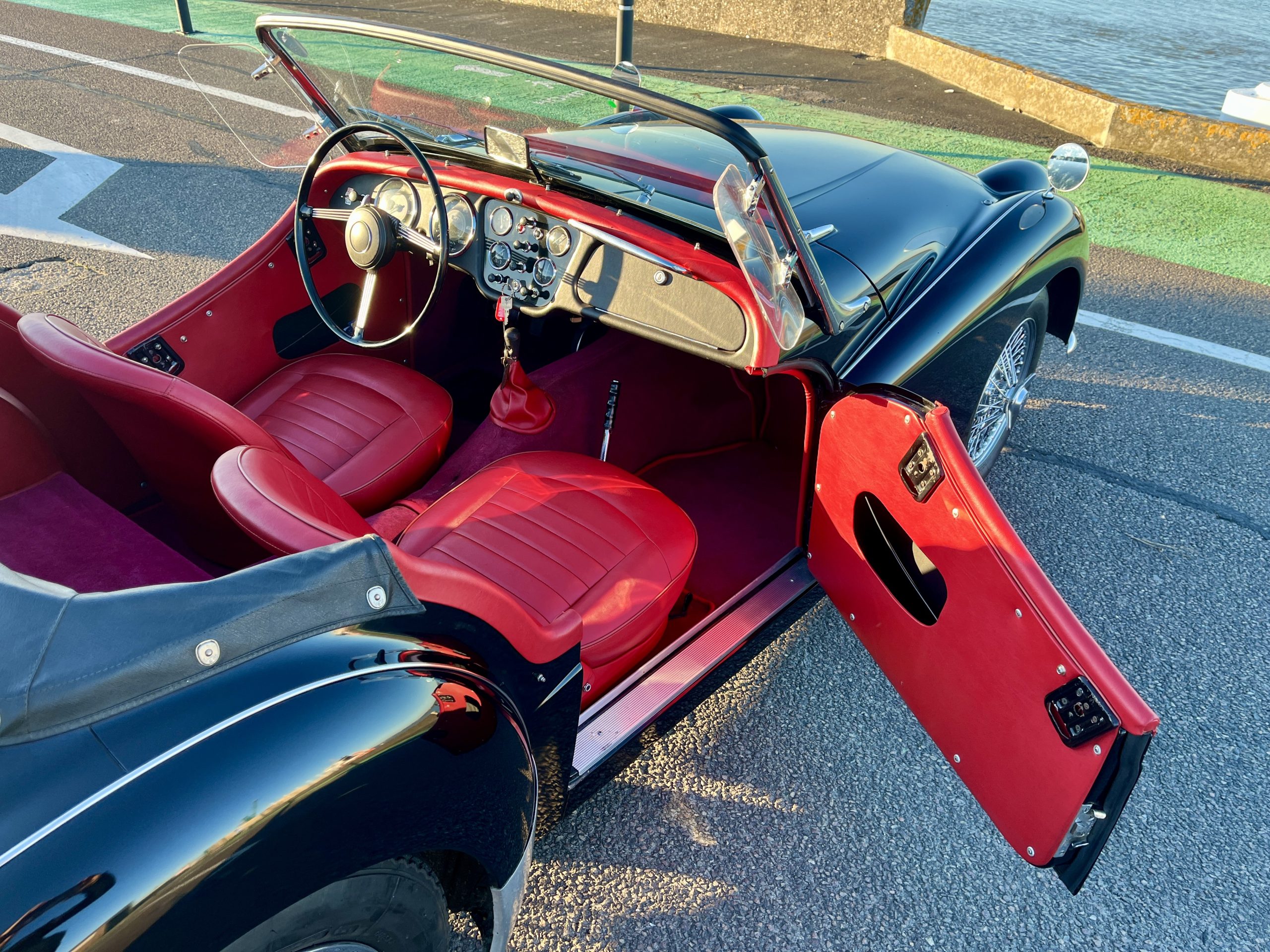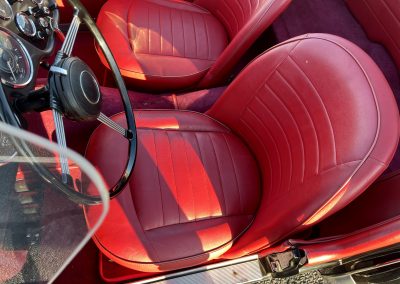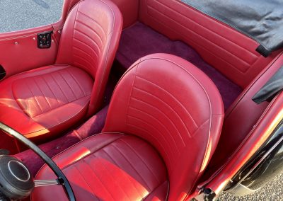 Noire intérieur rouge. Roues a rayons chromés, porte-bagages, couvre tonneau/capote, déflecteur d’air.