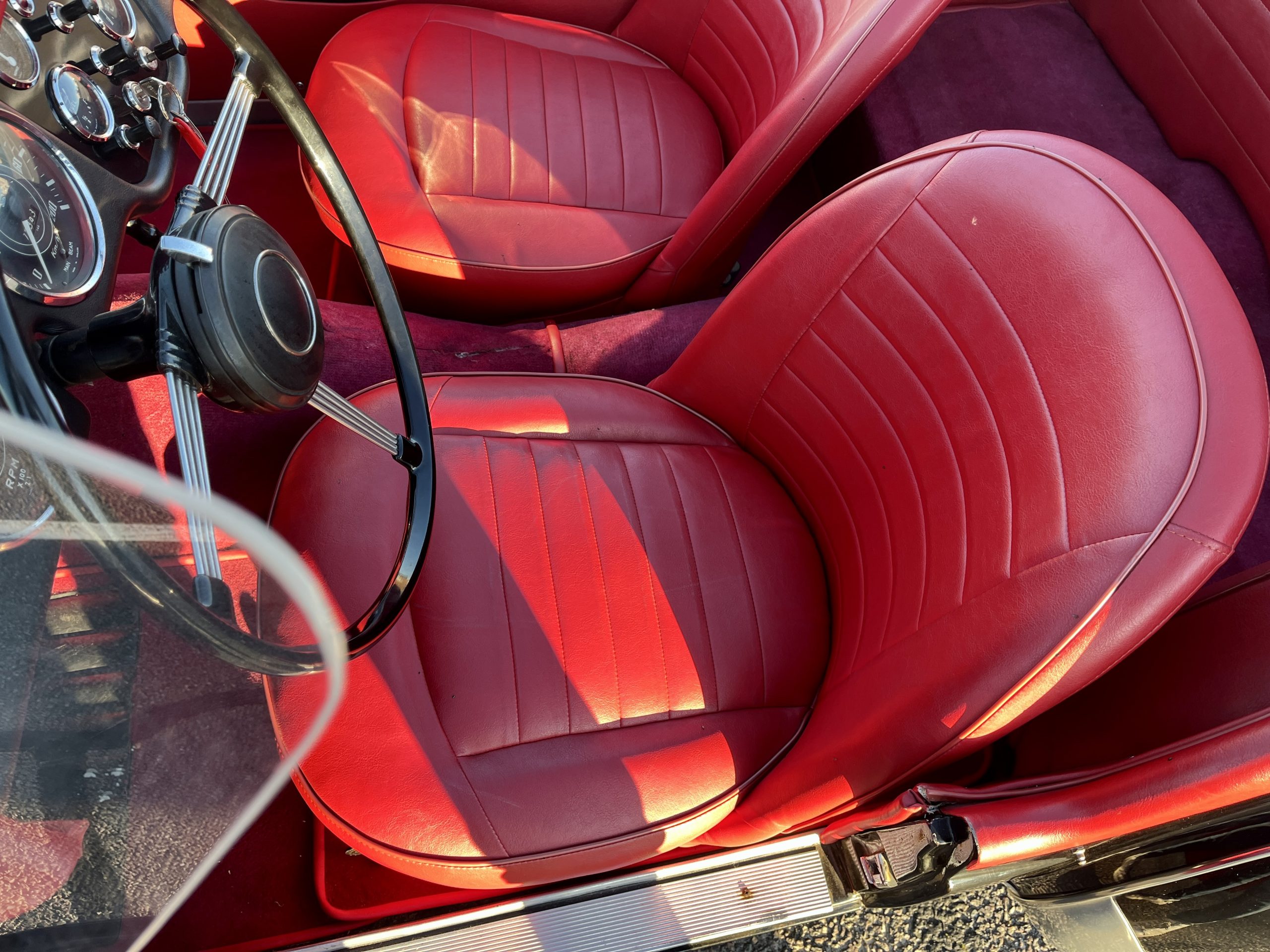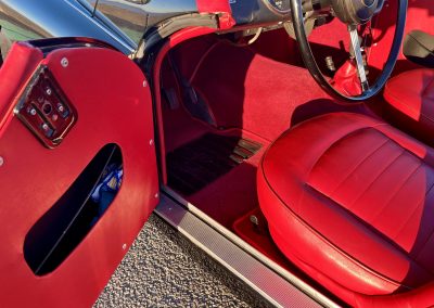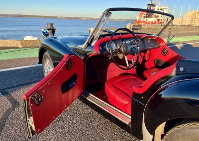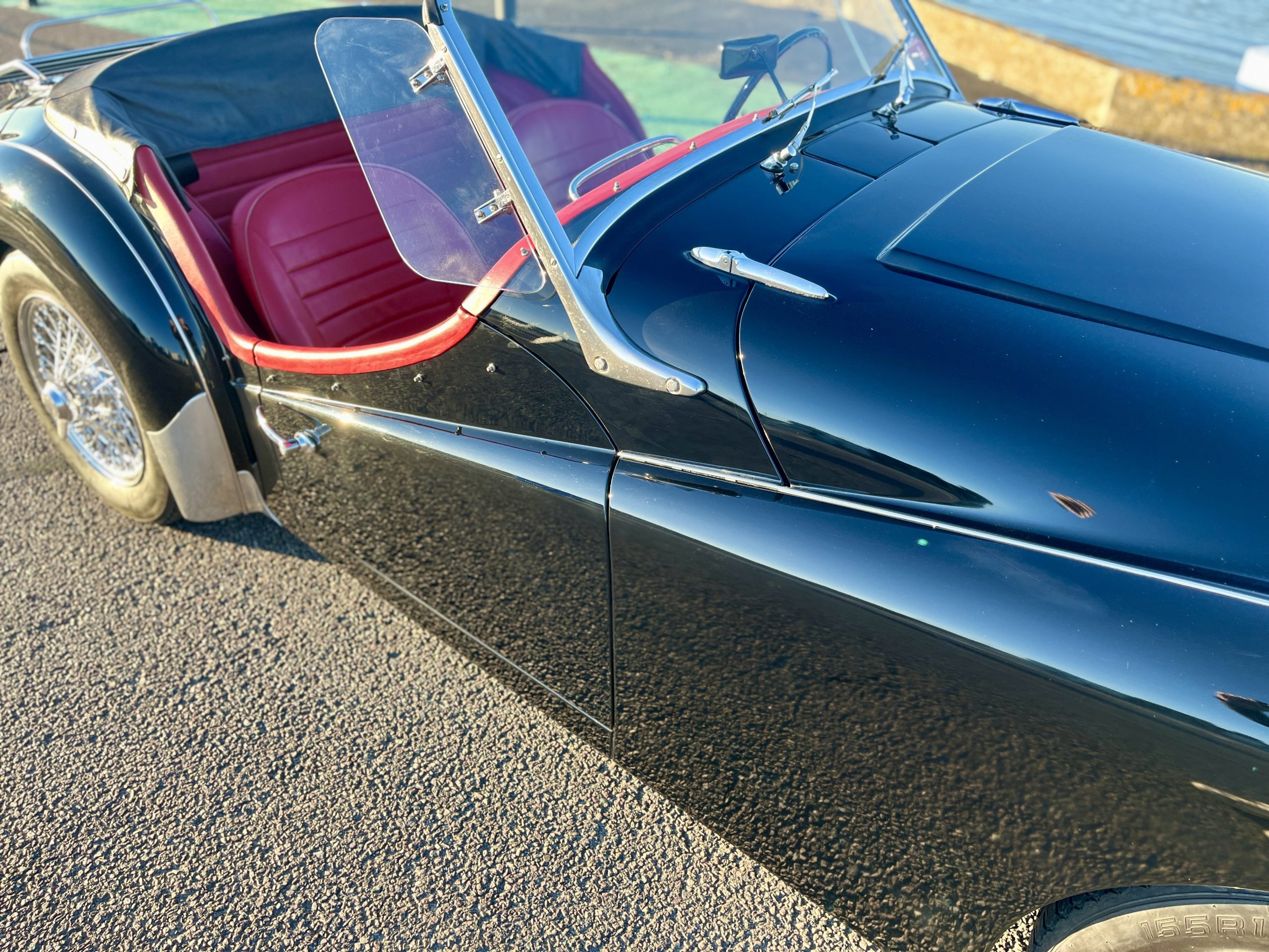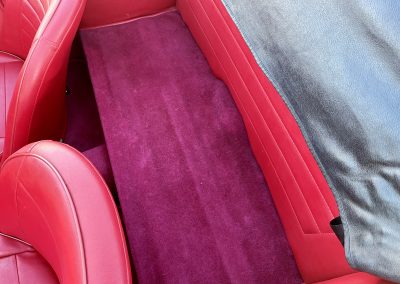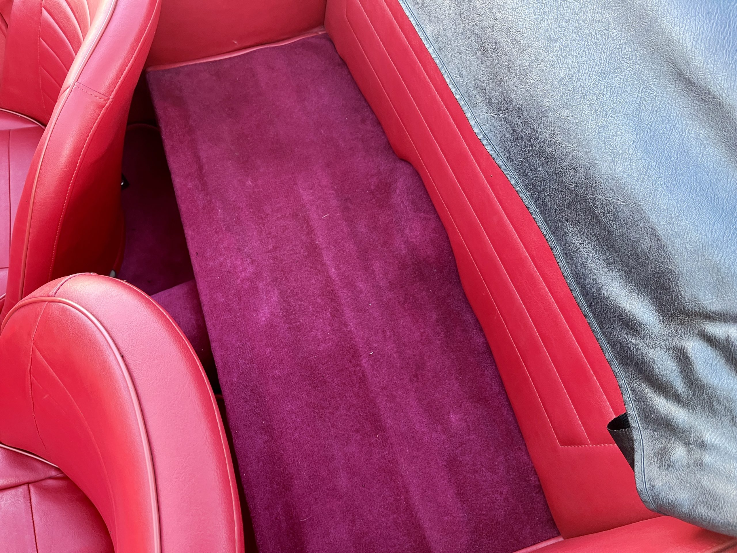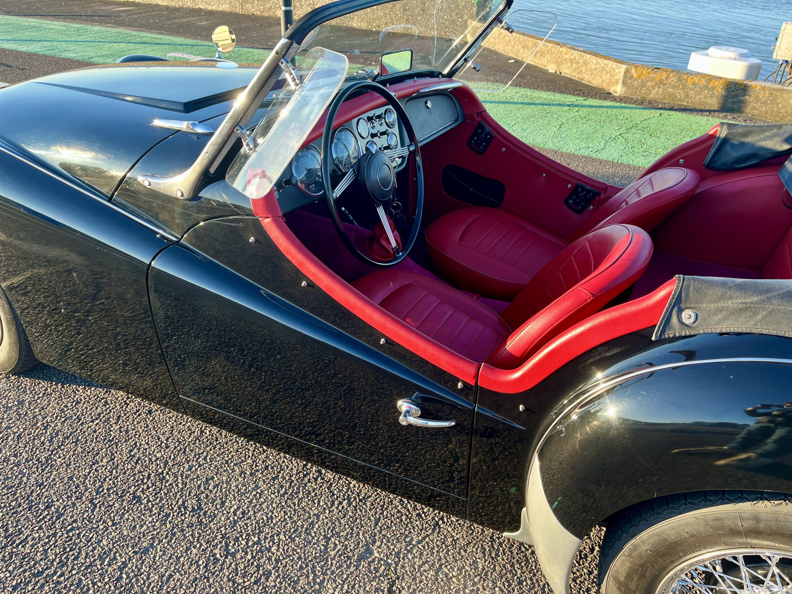 Noire intérieur rouge. Roues a rayons chromés, porte-bagages, couvre tonneau/capote, déflecteur d’air.