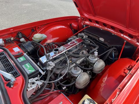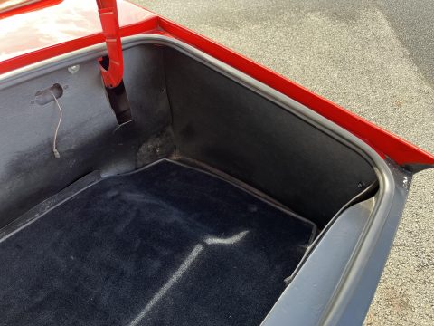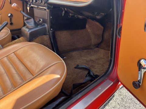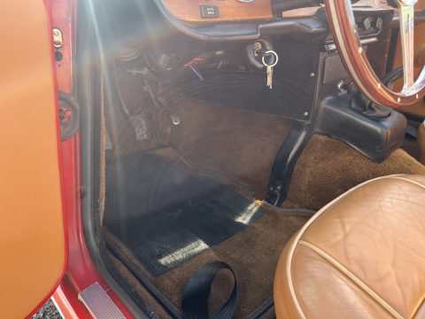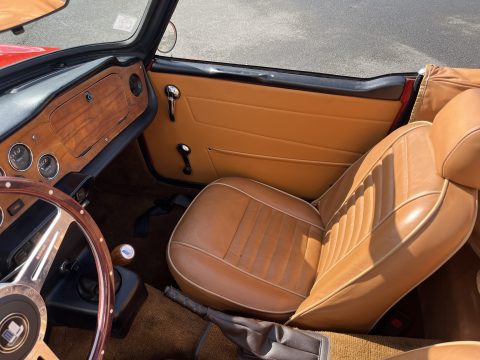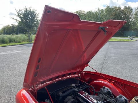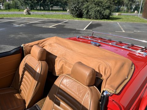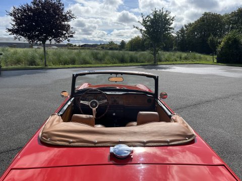 L’intérieur camel ainsi que les moquettes sont en excellent état. Les chromes de cette voiture ne sont pas neuf mais en très bon état. Cette voiture est également équipée d’une capote en Alpaga Mohair et de son couvre capote.